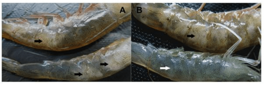 – Đục cơ do trong quá trình vận chuyển hoặc sang ao: Khi kéo lưới để bắt tôm cho mục đích thu tỉa hay sang ao, một số tôm sẽ bị stress và một phần hay toàn bộ cơ thịt của nó sẽ bị trắng đục, hoặc thỉnh thoảng có sự pha lẫn giữa màu trắng và màu tối khác thường như màu cam hoặc màu đỏ hồng. Hầu hết tôm có màu khác thường này sẽ chết. Những con khác bị nhẹ nếu có hồi phục thì cũng mất vài ngày màu sắc cơ thể mới trở lại bình thường. Biện pháp tốt nhất là phải kiểm tra sức khoẻ tôm trước khi di chuyển sang ao mới. Nếu tôm khoẻ mạnh thì nó có thể chịu đựng được stress. Nếu người nuôi bắt đầu chuyển tôm và phát hiện thấy một vài con chuyển sang trắng đục thì nên hoãn lại. Nước dùng vận chuyển tôm phải có nhiệt độ 24 – 25 0C và hàm lượng oxy phải cao.