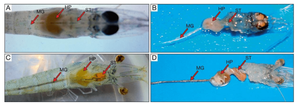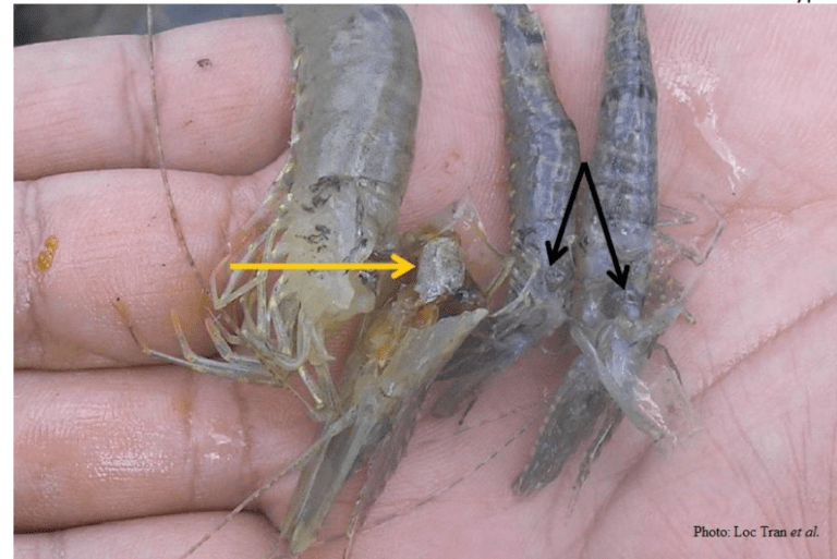 Tôm bệnh có khối gan tụy teo, gan tụy có màu nhợt nhạt đến trắng, ruột tôm không có thức ăn hoặc đứt đoạn, tôm thường mềm vỏ, tỷ lệ tôm chết cao. Tôm sú bệnh EMS thường có màu đậm, chậm lớn (tương tự như bệnh còi MBV) các biểu hiện trên gan tụy tương tự như trên thẻ chân trắng như màu sắc nhợt nhạt, gan tụy teo, ruột không có thức ăn.